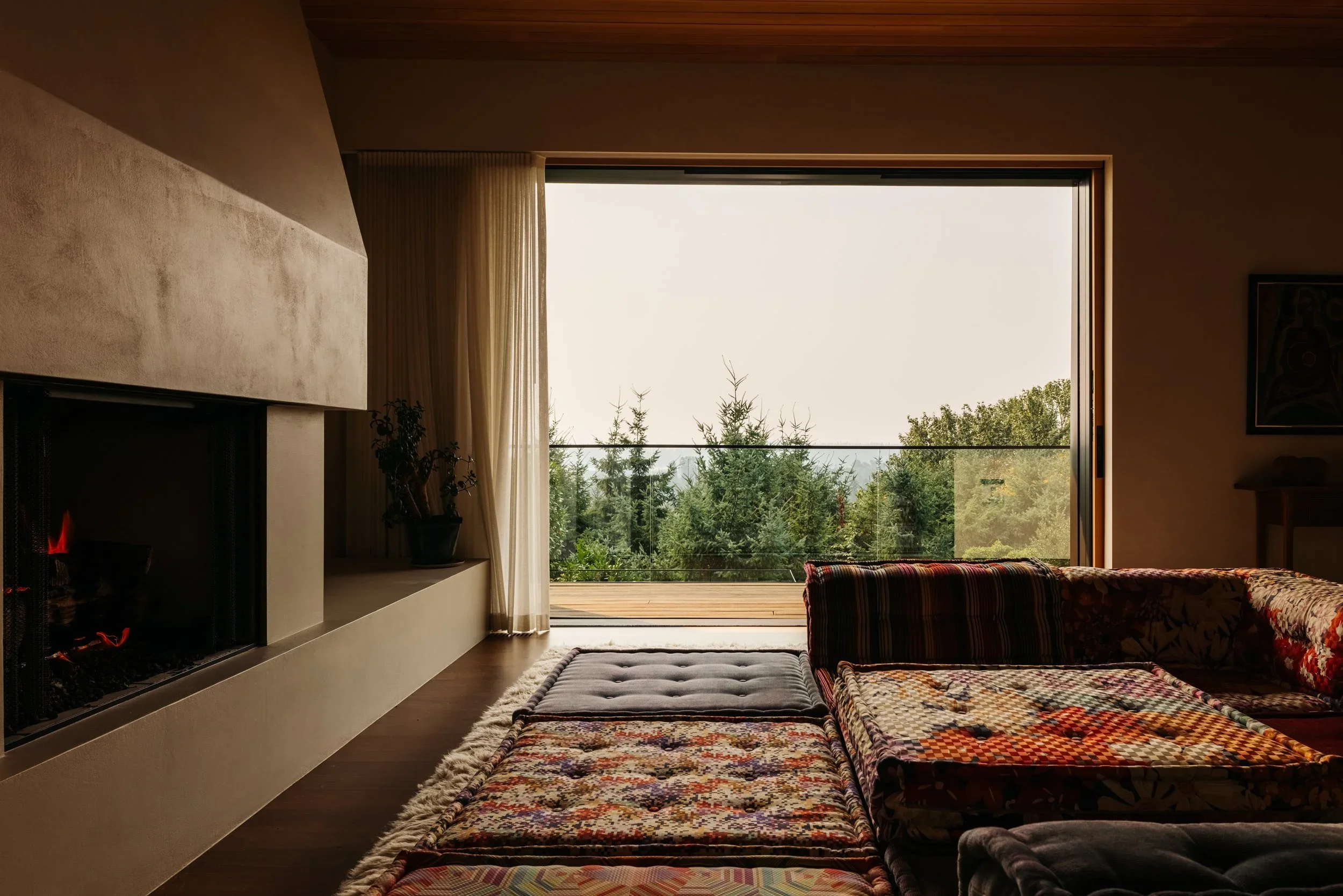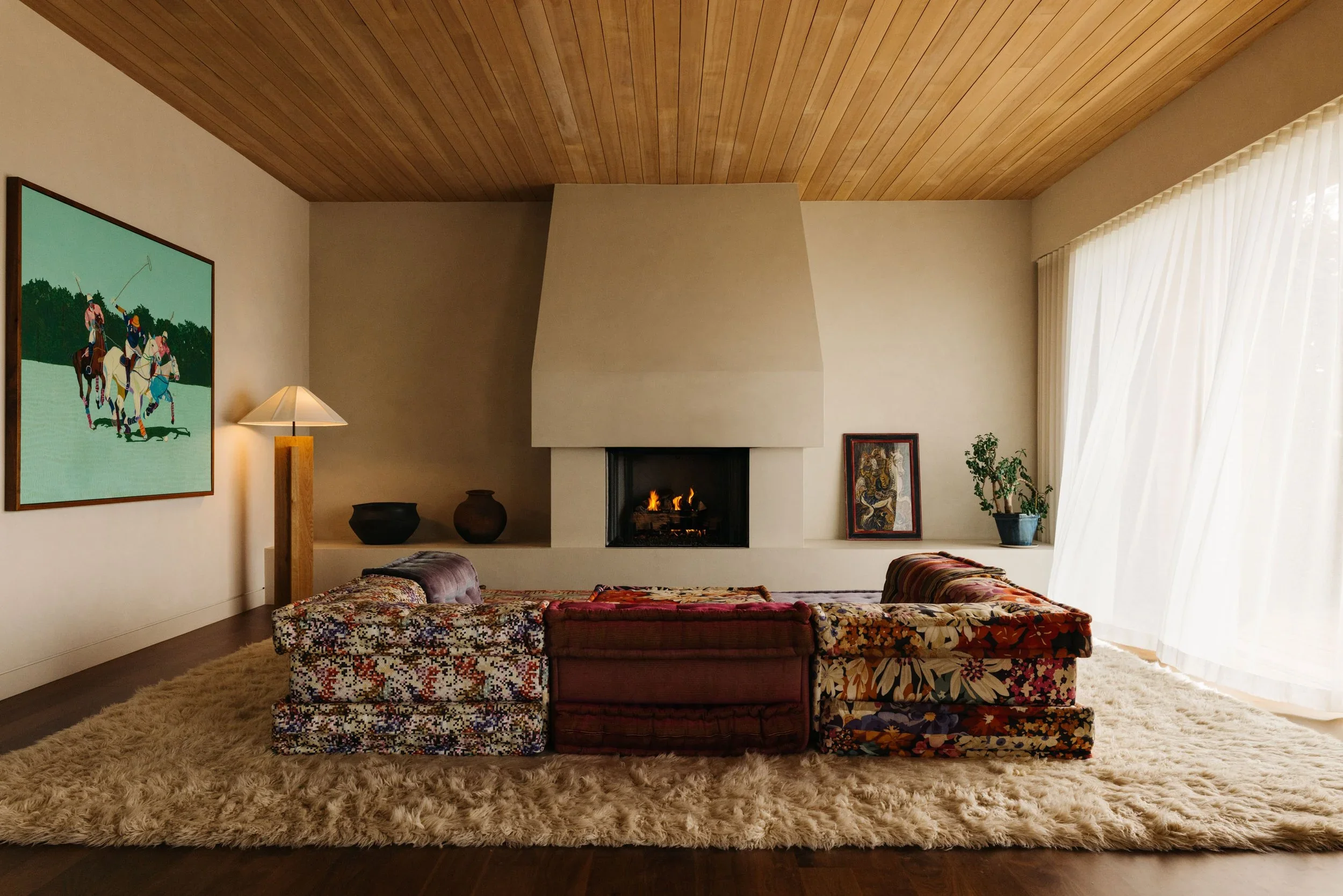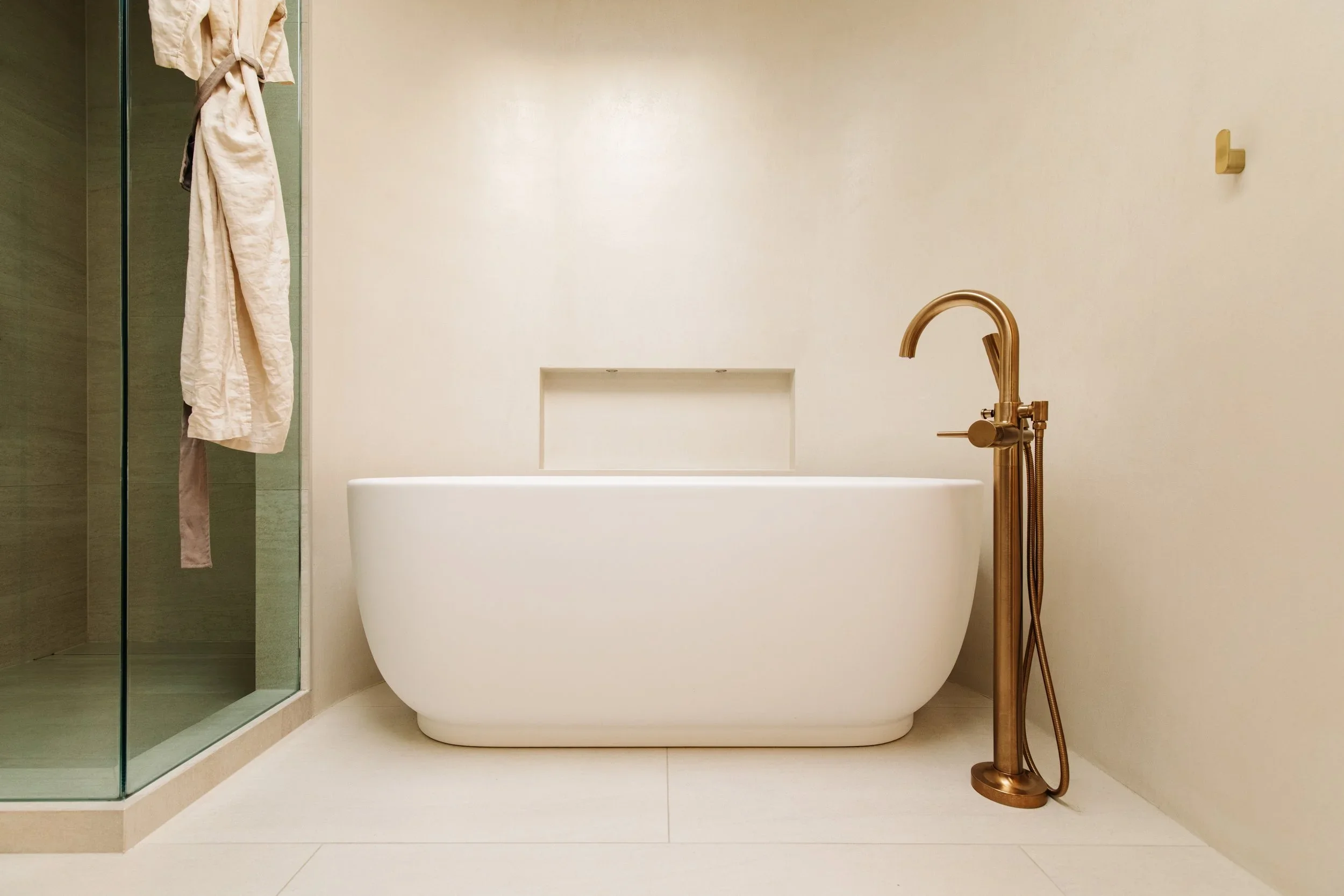 The living room captures your attention with Microtopping® as the focal point applied to the impressive fireplace and back wall. Also featured in the bathrooms where we applied it seamlessly from the walls onto the vanity countertops and sinks.